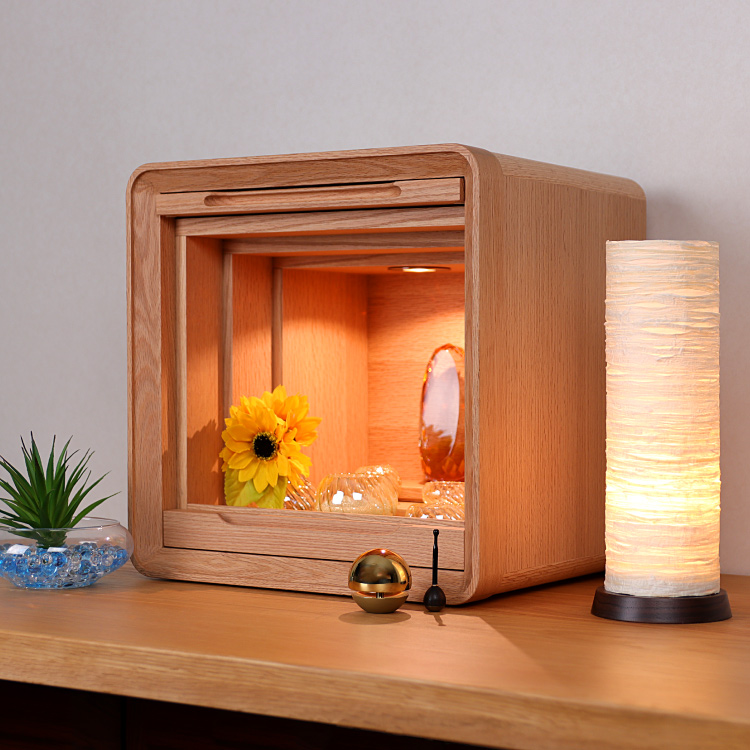 おしゃれなモダン仏壇です。扉が中に収まるコンパクトな上置き仏壇なのでリビングやマンションに置きやすく、日本製ならではの高い品質と仏具をのせて動かせる便利な須弥壇が魅力です。
