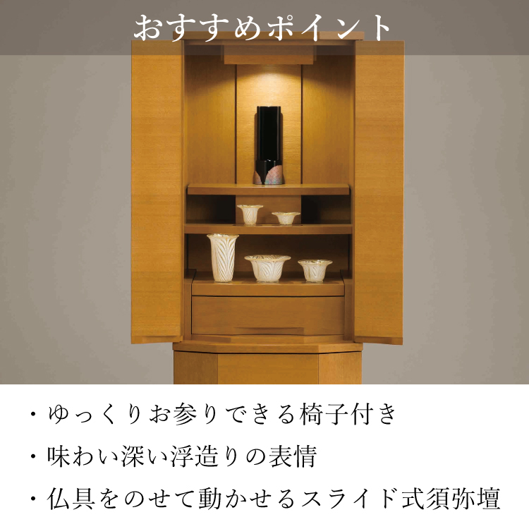 おしゃれなモダン仏壇です。日本製ならではの浮造りの扉やキャスター付き椅子、仏具をのせて動かせる須弥壇などリビングやマンションに置きやすく、安らぎのインテリア空間を演出します。