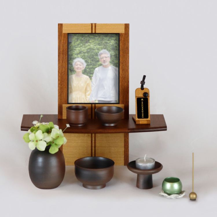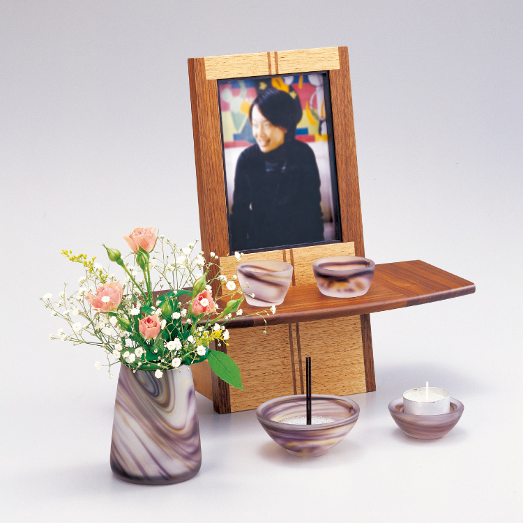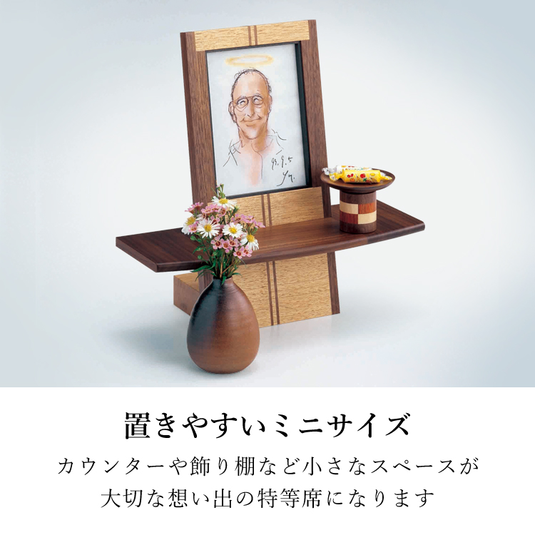 おしゃれなモダン仏壇です。小さいオープンタイプなのでリビングやマンションに置きやすく、シンプルな手元供養におすすめ。日本製ならではの精緻な象嵌細工がインテリアに馴染みます。