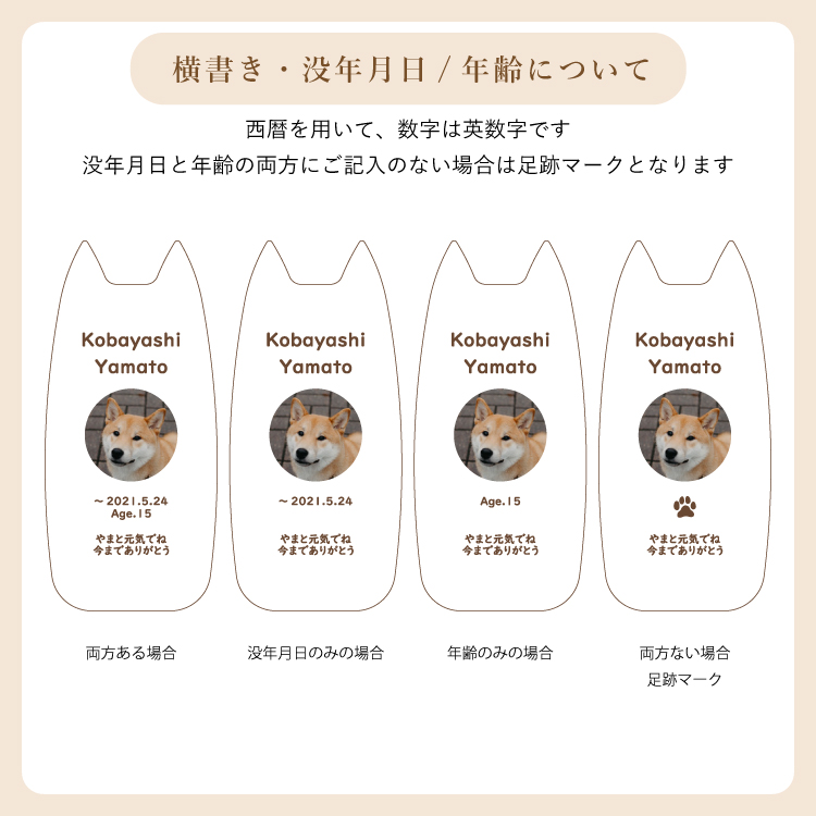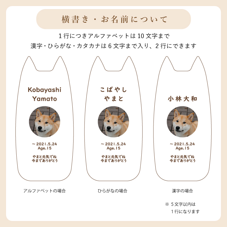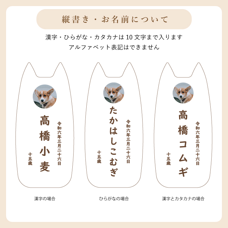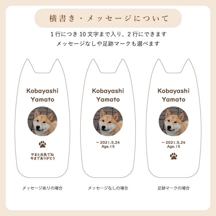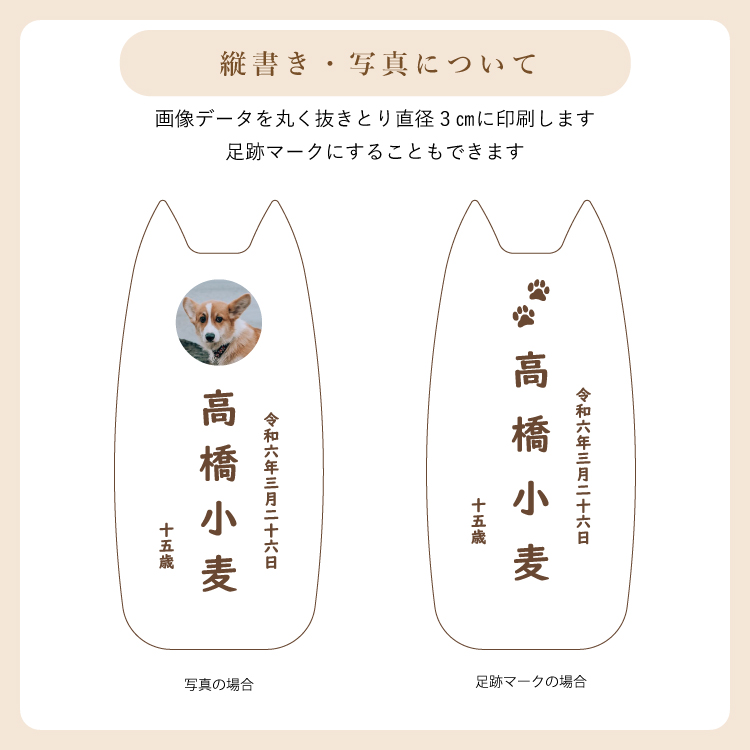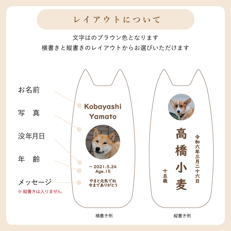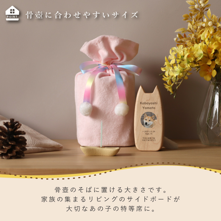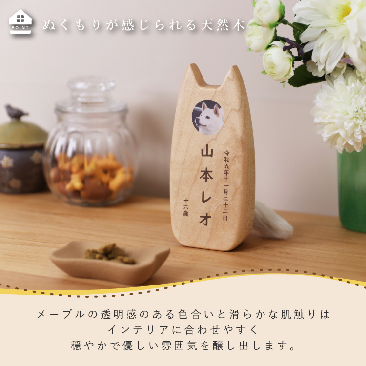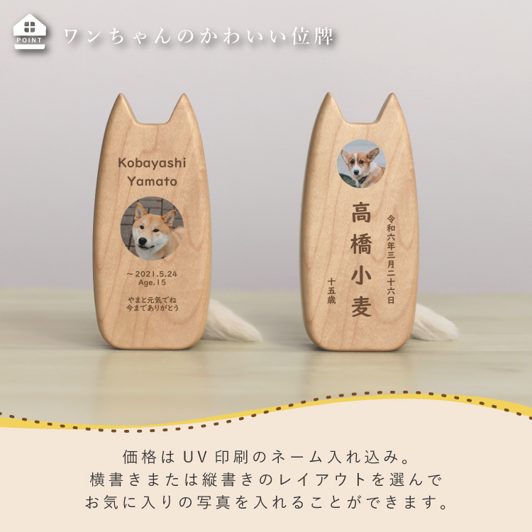 ピコ ワンチョA ▼ 価格・仕様を見る 画像をクリックすると切り替わります 価格・仕様 商品名ピコ ワンチョA 価格(税込)¥22,000 サイズ (mm) W(幅) :56 D(奥行き) :55 H(高さ) :120 材質メープル ポリエステル 仕上ウレタン塗装 製造国日本製 かわいい犬型の位牌。大切なワンちゃんのお名前や写真を入れて供養することができます。仏壇や祭壇のメモリアルグッズと置きやすいコンパクトサイズです。 ページの先頭へ 関連商品 ワンチョA 本体:ホワイト 首輪:ハウス(ネイビー) ペット供養 ¥30,800 香皿【骨】キャメル ペット供養 ¥3,300 香皿【魚】グレー ペット供養 ¥3,300