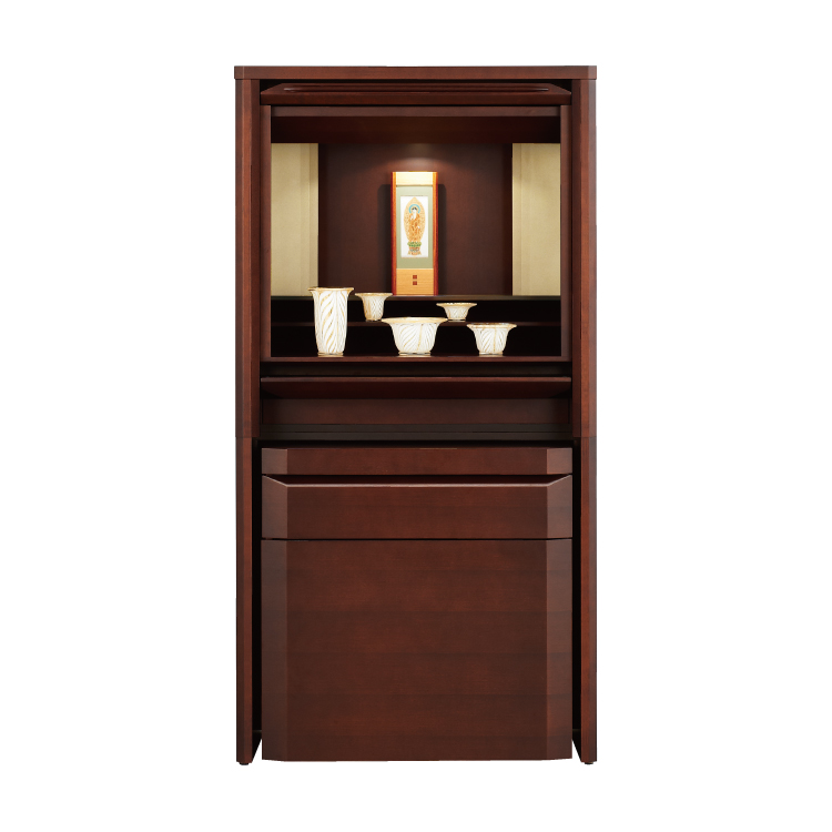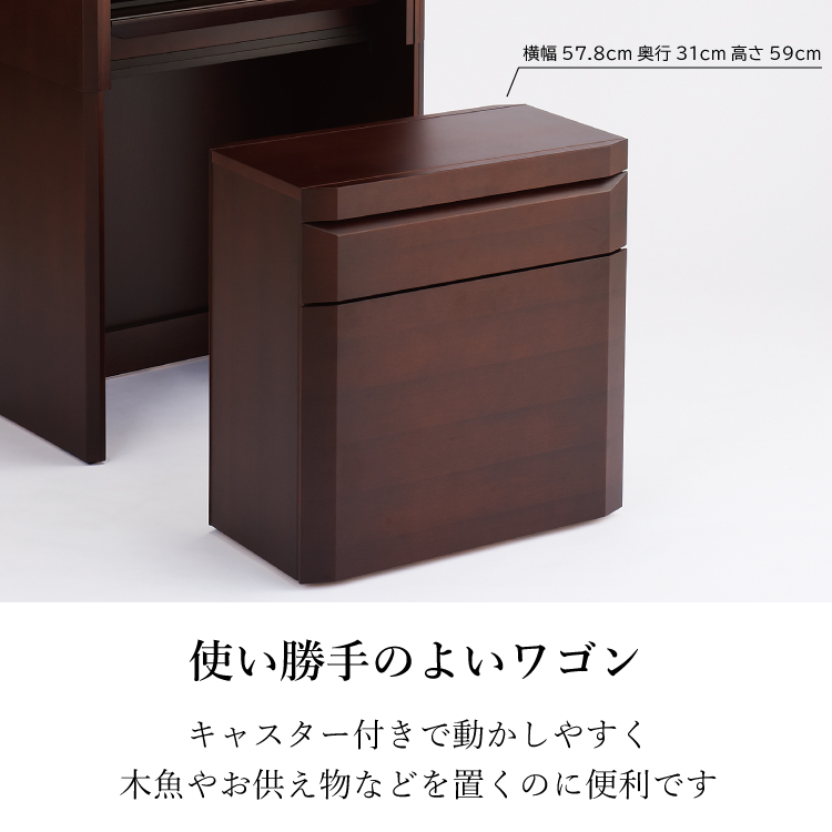 おしゃれなモダン仏壇です。リビングやマンションで椅子に座った高さに設計。シンプルで馴染みやすく、日本製ならではの丁寧な作りで収納できる扉やキャスター付きワゴンを備えています。