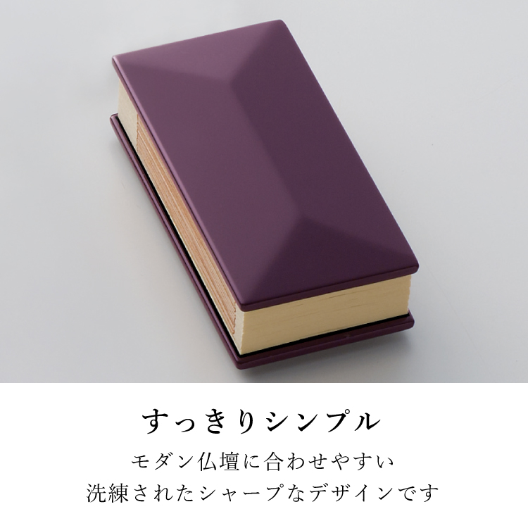ミュラー・バイオレット 3.5寸 ▼ 価格・仕様を見る 画像をクリックすると切り替わります 価格・仕様 商品名ミュラー・バイオレット 3.5寸 価格(税込)¥28,600 サイズ (mm) W(幅) :50 D(奥行き) :25 H(高さ) :105 材質ヒバ MDF 仕上ウレタン塗装漆仕上 製造国日本製 モダンな過去帳です。職人の技が光る洗練されたおしゃれなデザインです。浄土真宗を始め全宗派でご使用いただけます。 ページの先頭へ 関連商品 ちりめんキャンドル Hasu LED お盆・盆提灯・お供物・仏花 ¥2,640 レグルス 4.0寸 位牌 ¥44,000 コラボ ダーク 経机・仏壇専用台・椅子 仏壇専用台・経机 ¥220,000