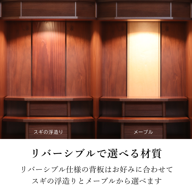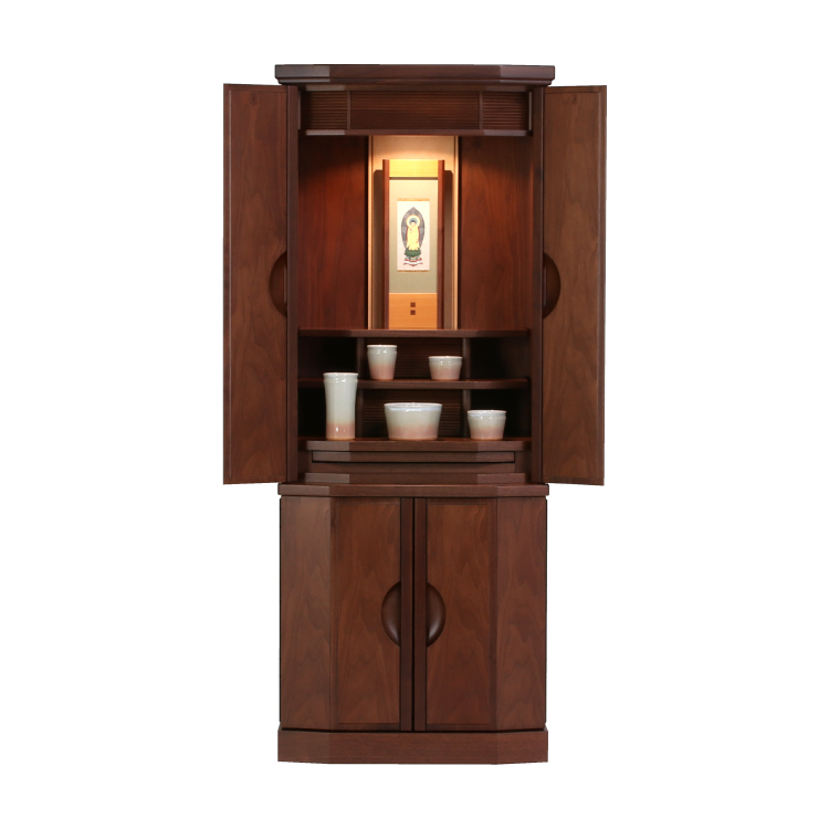 メヌエット 1100 ▼ 価格・仕様を見る 画像をクリックすると切り替わります 価格・仕様 商品名メヌエット 1100 価格(税込)¥495,000 サイズ (mm) W(幅) :440 D(奥行き) :360 H(高さ) :1100 重量約 32 kg 材質ウォールナット メープル 仕上ウレタン塗装 照明LED 仕様・引き出し付き ・須弥壇の取り外し可能(上段のみ) ・背板リバーシブル仕様 ・ストレートヒンジ使用 製造国日本製 おしゃれなモダン仏壇です。25年以上続くロングセラー・デザイン。日本製ならではの高品質で和室だけでなくリビングやマンションに馴染み、ワンランク上のインテリア空間を演出します。 ページの先頭へ 関連商品 アトリア ライト 上置き(コンパクト)仏壇 ¥187,000 ピリエファミーユ クルト ウォールナット 台付き(床置き)仏壇 ¥3,960,000 マルコII 台付き(床置き)仏壇 ¥990,000