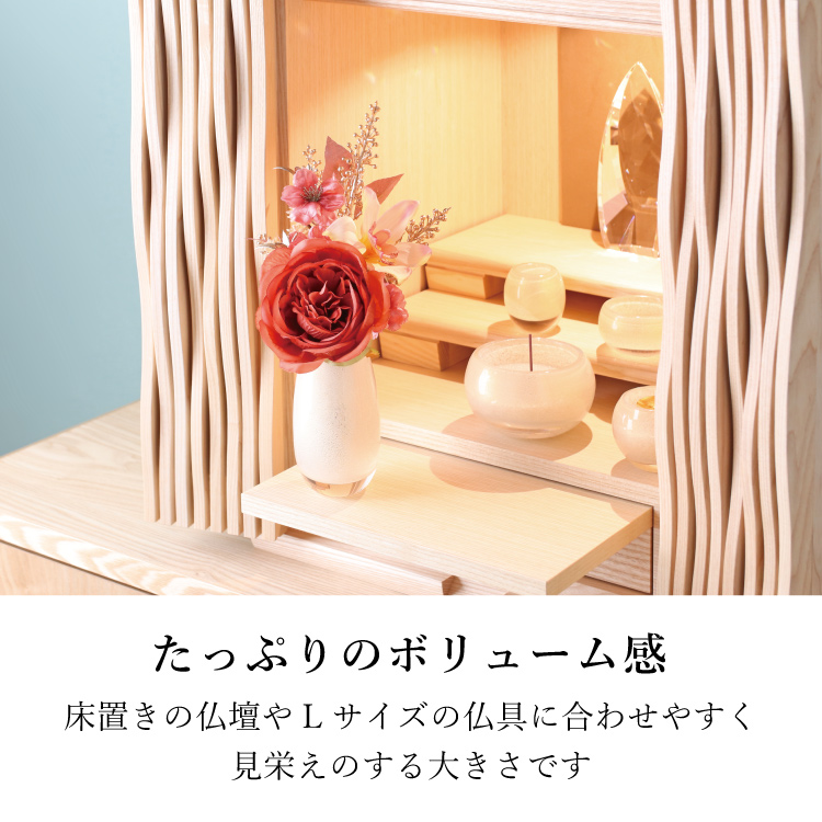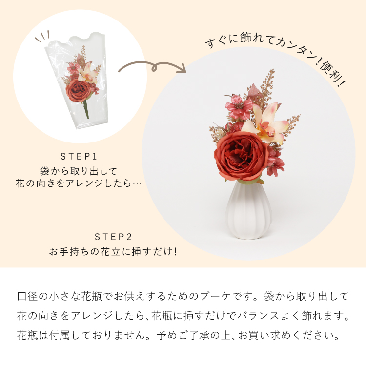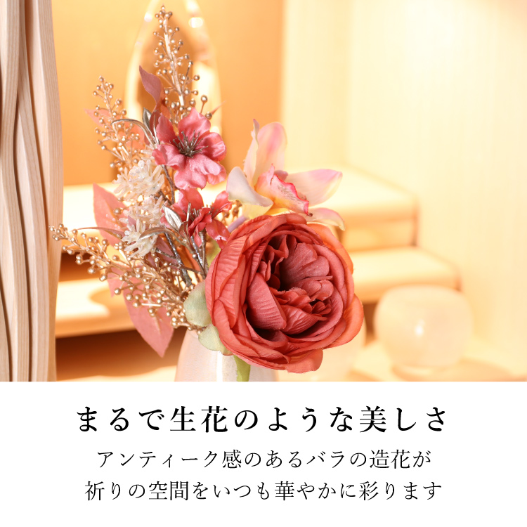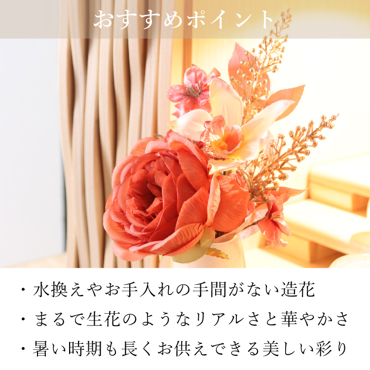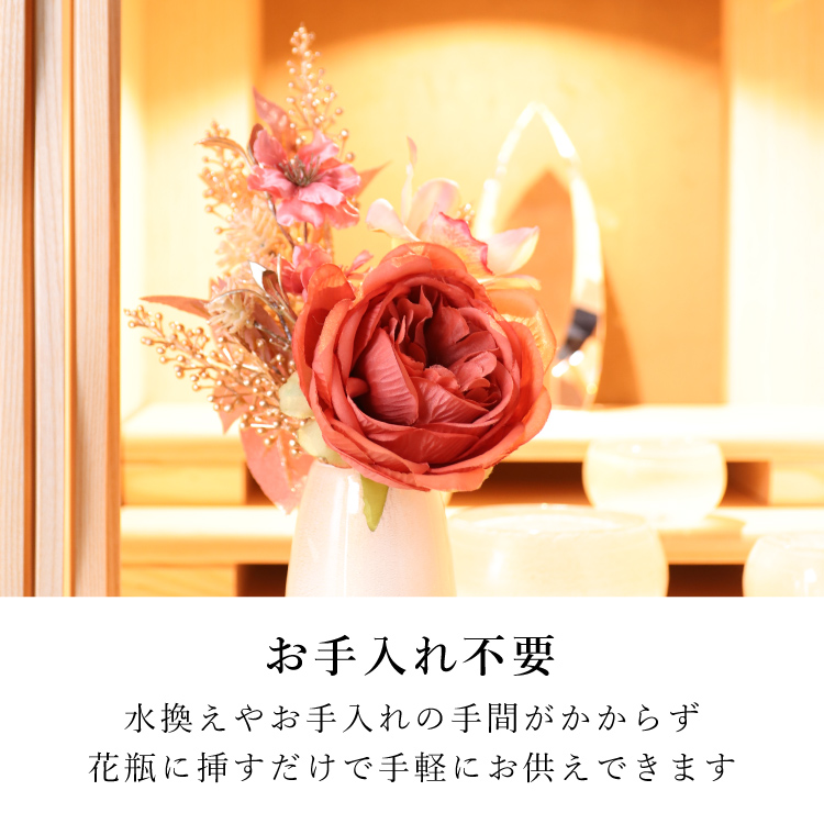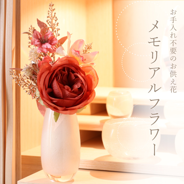 メモリアルフラワー 響 ▼ 価格・仕様を見る 画像をクリックすると切り替わります 価格・仕様 商品名メモリアルフラワー 響 価格(税込)¥4,730 サイズ (mm) W(幅) :170 H(高さ) :260 材質ポリエステル ポリエチレン 製造国日本製 枯れない仏花です。おしゃれな造花なのでインテリアに馴染み、そのまま仏壇にお供えできて手間をかけずに長く飾れます。お盆やお彼岸、法事の贈り物としてもご利用いただけます。 ページの先頭へ 関連商品 イーリ 念珠・その他仏具 ¥27,500 春かご ミニ骨壺・コアボトル ¥25,300 コンビ ライト 経机・仏壇専用台・椅子 仏壇専用台・経机 ¥159,500