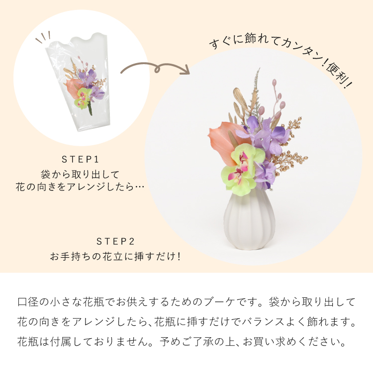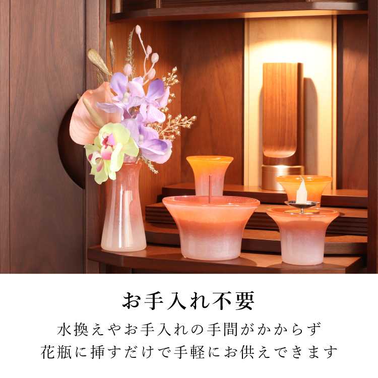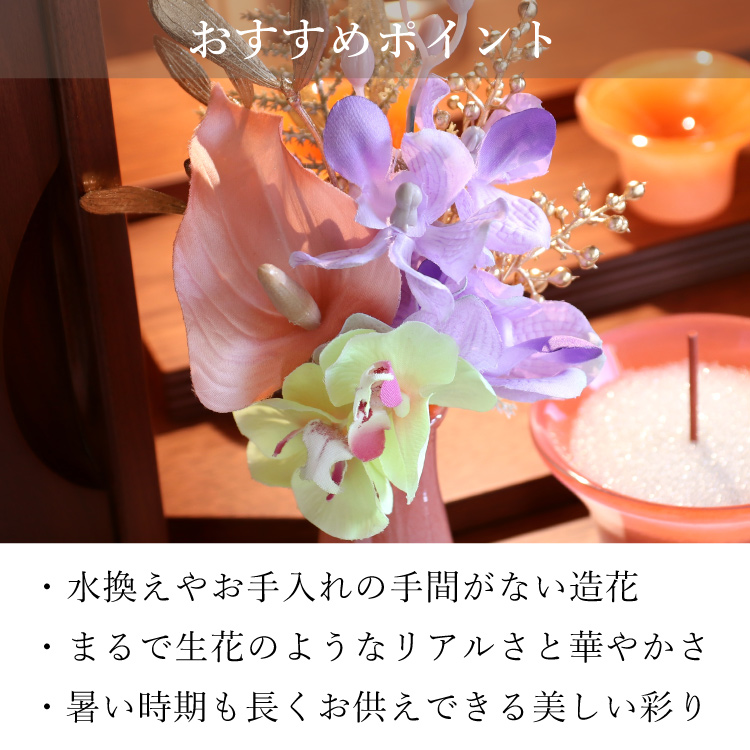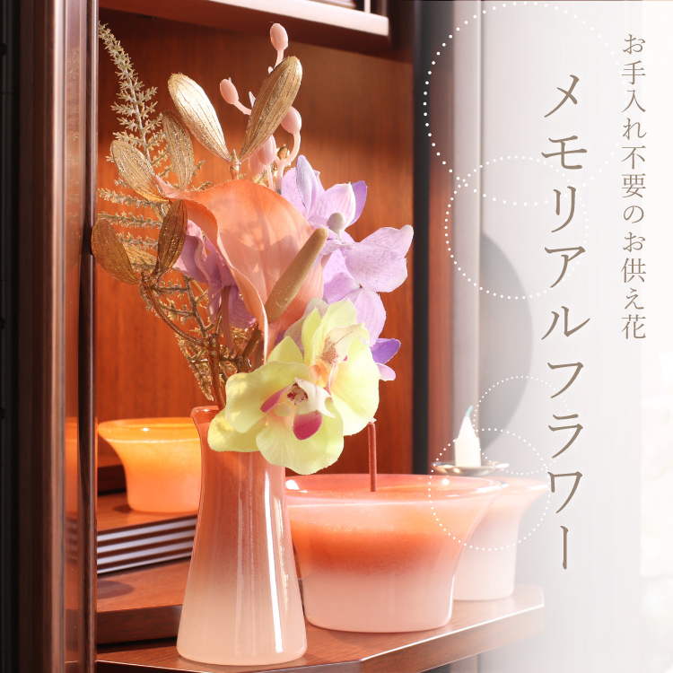 メモリアルフラワーmini トルマリン ▼ 価格・仕様を見る 画像をクリックすると切り替わります 価格・仕様 商品名メモリアルフラワーmini トルマリン 価格(税込)¥2,750 サイズ (mm) W(幅) :140 H(高さ) :210 材質ポリエステル ポリエチレン 製造国日本製 枯れない仏花です。おしゃれな造花なのでインテリアに馴染み、そのまま仏壇にお供えできて手間をかけずに長く飾れます。お盆やお彼岸、法事の贈り物としてもご利用いただけます。 ページの先頭へ 関連商品 乗明リン 2.0寸 朧銀 念珠・その他仏具 ¥19,800 ペンダント位牌 カリン 位牌 ¥24,200 ルミナス 仏具・神具 ¥110,000