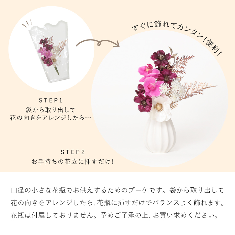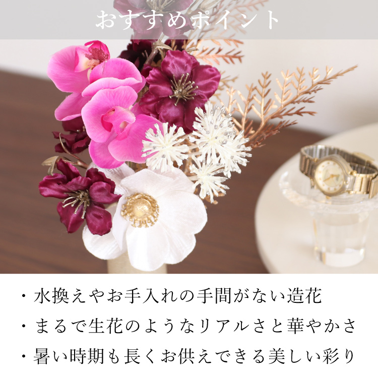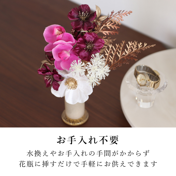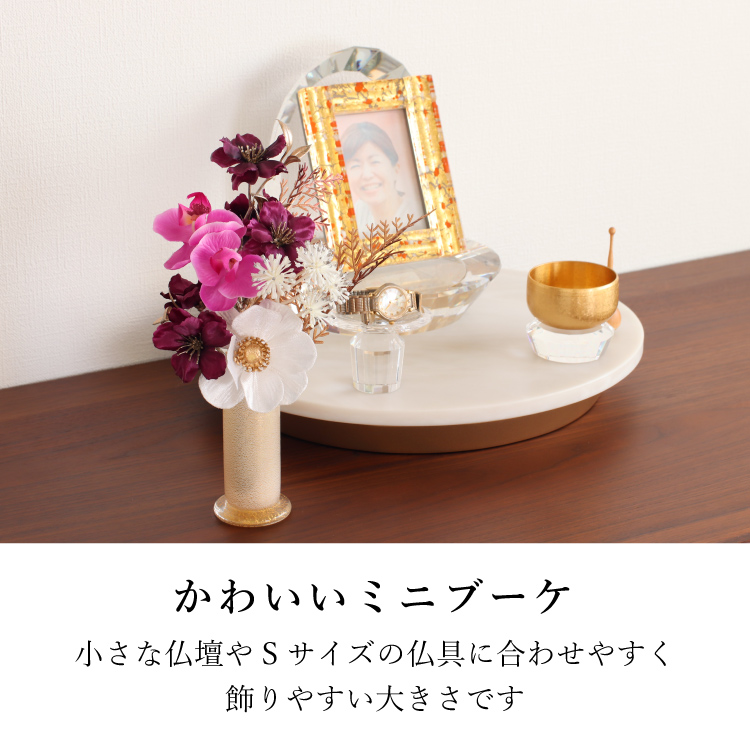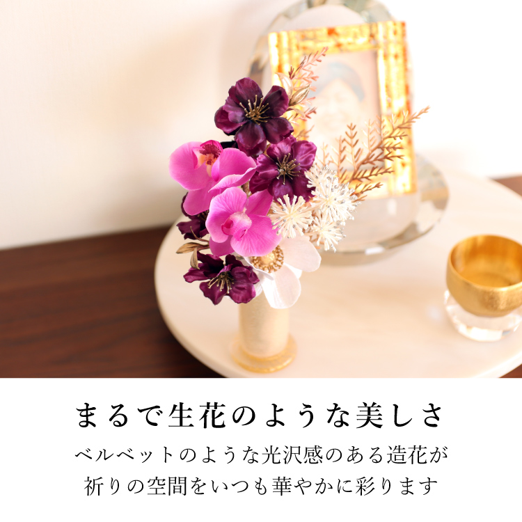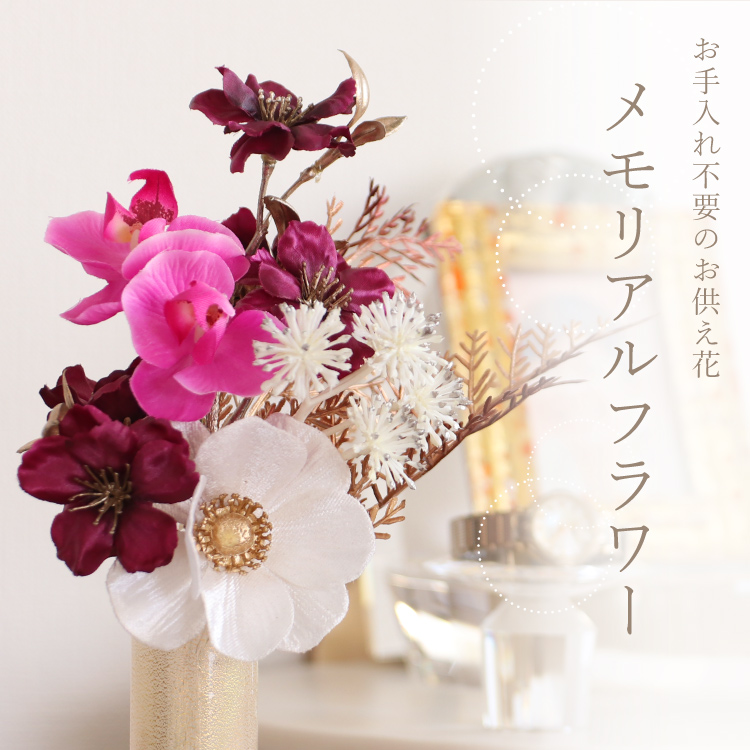 メモリアルフラワーmini パープルダイヤ ▼ 価格・仕様を見る 画像をクリックすると切り替わります 価格・仕様 商品名メモリアルフラワーmini パープルダイヤ 価格(税込)¥2,750 サイズ (mm) W(幅) :140 H(高さ) :220 材質ポリエステル ポリエチレン 製造国日本製 枯れない仏花です。おしゃれな造花なのでインテリアに馴染み、そのまま仏壇にお供えできて手間をかけずに長く飾れます。お盆やお彼岸、法事の贈り物としてもご利用いただけます。 ページの先頭へ 関連商品 トレンタL お盆・盆提灯・お供物・仏花 ¥49,500 自在掛軸 三幅セット ウォールナット 掛軸 ¥115,500 メモリアルフラワー正月花 藍 お盆・盆提灯・お供物・仏花 ¥3,960