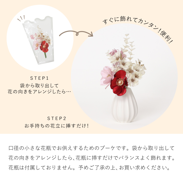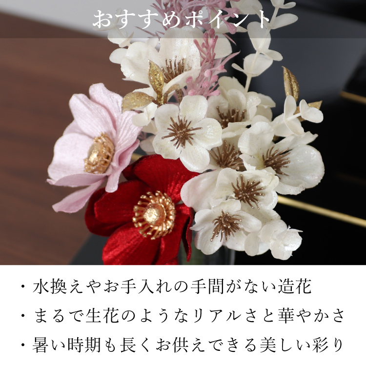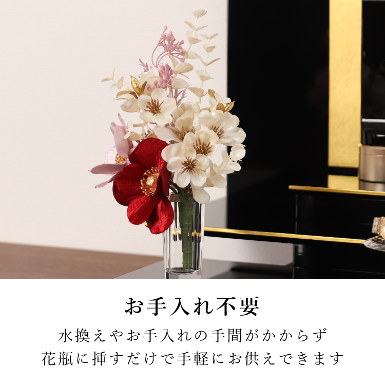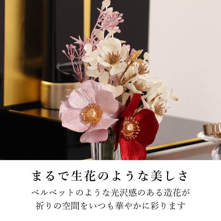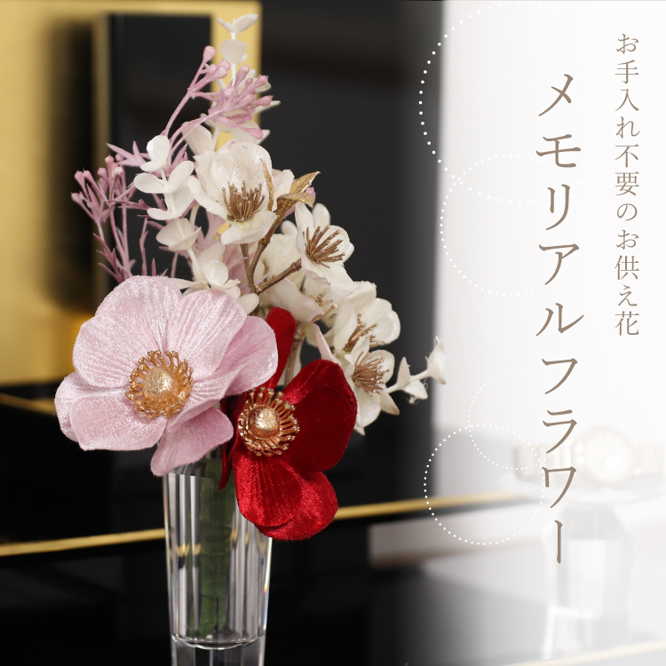 メモリアルフラワーmini パール ▼ 価格・仕様を見る 画像をクリックすると切り替わります 価格・仕様 商品名メモリアルフラワーmini パール 価格(税込)¥2,750 サイズ (mm) W(幅) :130 H(高さ) :200 材質ポリエステル ポリエチレン 製造国日本製 枯れない仏花です。おしゃれな造花なのでインテリアに馴染み、そのまま仏壇にお供えできて手間をかけずに長く飾れます。お盆やお彼岸、法事の贈り物としてもご利用いただけます。 ページの先頭へ 関連商品 小浜 おばま 仏具・神具 ¥19,800 盆提灯 フルール ホワイト お盆・盆提灯・お供物・仏花 ¥2,640 ラムダII バイオレット 4.0寸 位牌 ¥39,050