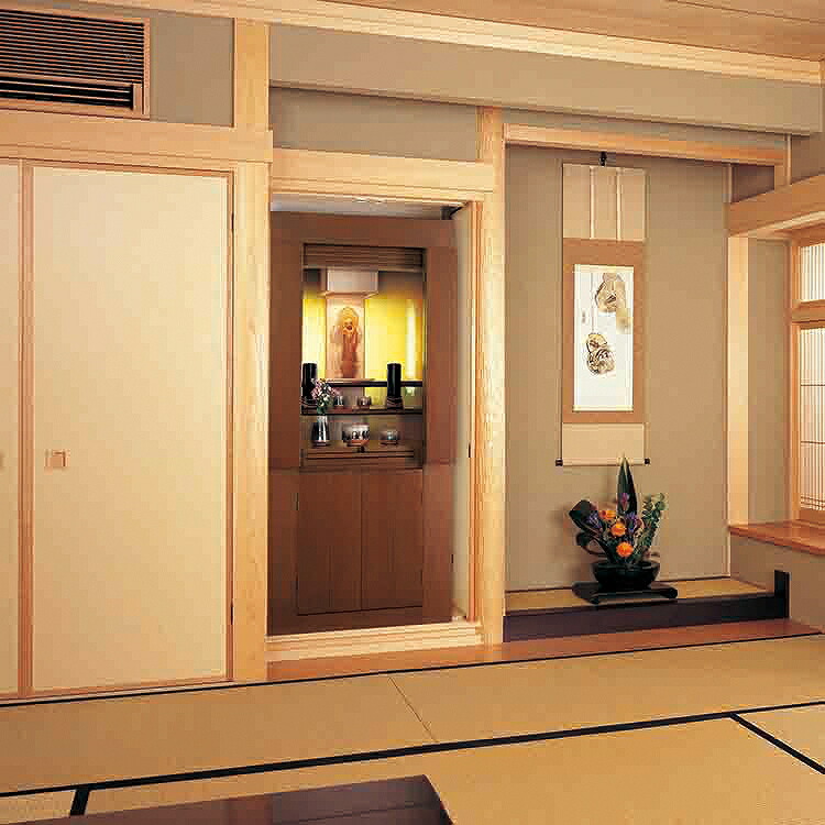 おしゃれなモダン仏壇です。日本製ならではの高い品質でマンションにも置ける半間のサイズに仕上げました。扉はコンパクトに折りたため、シンプルで広い内部は金色の光に包まれます。