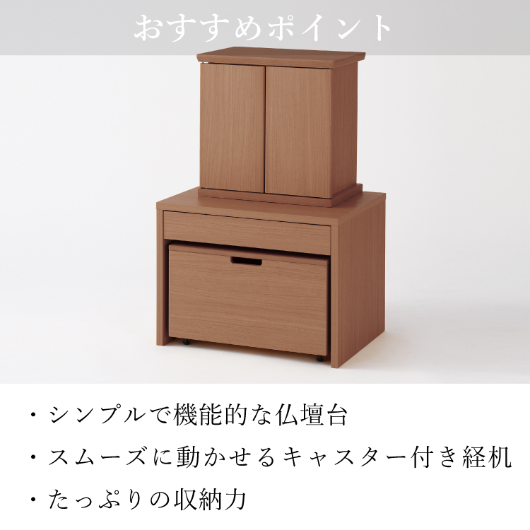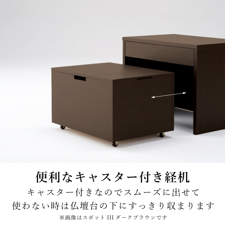 仏壇台 スポットIII ブラウン ▼ 価格・仕様を見る 画像をクリックすると切り替わります 価格・仕様 商品名仏壇台 スポットIII ブラウン 価格(税込)¥49,500 サイズ (mm) W(幅) :600 D(奥行き) :445 H(高さ) :450 重量約 12 kg 材質フラッシュ合板 仕上木目柄化粧板 製造国タイ製 経机付きのモダンな仏壇専用台。お参りに便利な経机はスムーズに引き出せるキャスターを備え、内部の収納空間に使わないものをすっきり片付けられます。 ページの先頭へ 関連商品 手元スイッチ その他 ¥1,870 オアシスライト用アダプター その他 ¥6,490 ローソク球パック 2個セット その他 ¥726