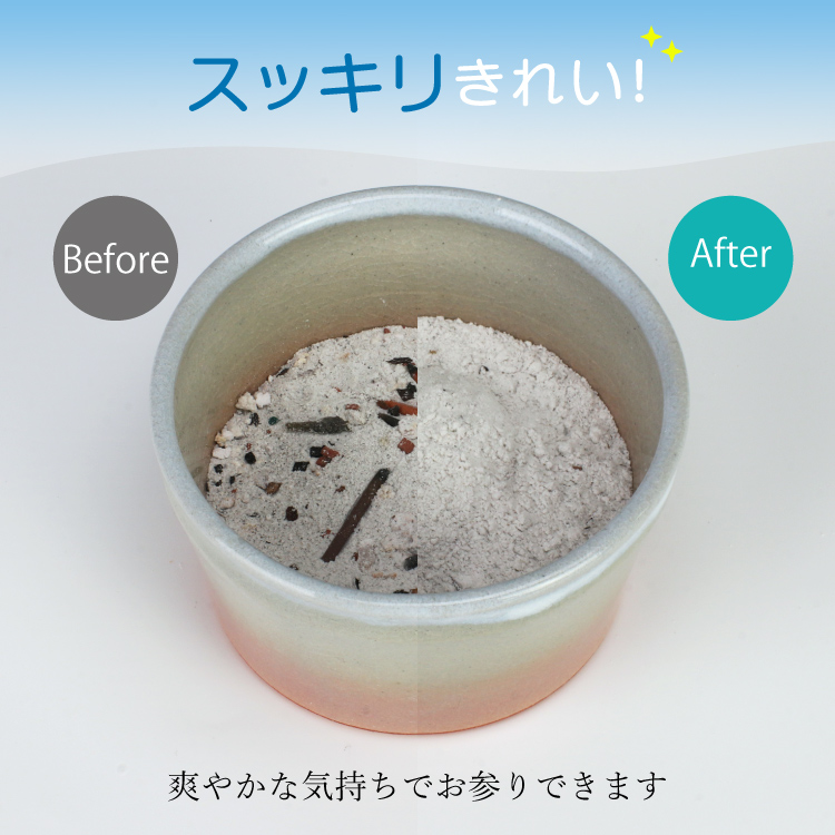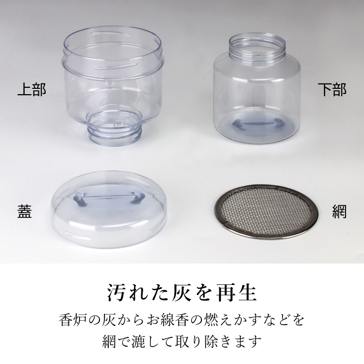 仏壇灰きれい 本灰タイプ ▼ 価格・仕様を見る 画像をクリックすると切り替わります 価格・仕様 商品名仏壇灰きれい 本灰タイプ 価格(税込)¥1,210 サイズ (mm) W(幅) :90 D(奥行き) :90 H(高さ) :180 材質塩化ビニル樹脂 製造国日本製 仏壇の香炉灰を掃除するお手入れ用品です。灰をふるいにかけて、お線香の燃えかすを取り除き、再生した灰を仏具に戻します。お盆やお彼岸、法事の掃除用品にご活用ください。 ページの先頭へ 関連商品 虹 L 念珠・その他仏具 ¥13,200 メモリアルフラワーmini トルマリン お盆・盆提灯・お供物・仏花 ¥2,750 ヴェネツィアン フォトフレーム VP-001SS 写真立て・フォトフレーム ¥9,900