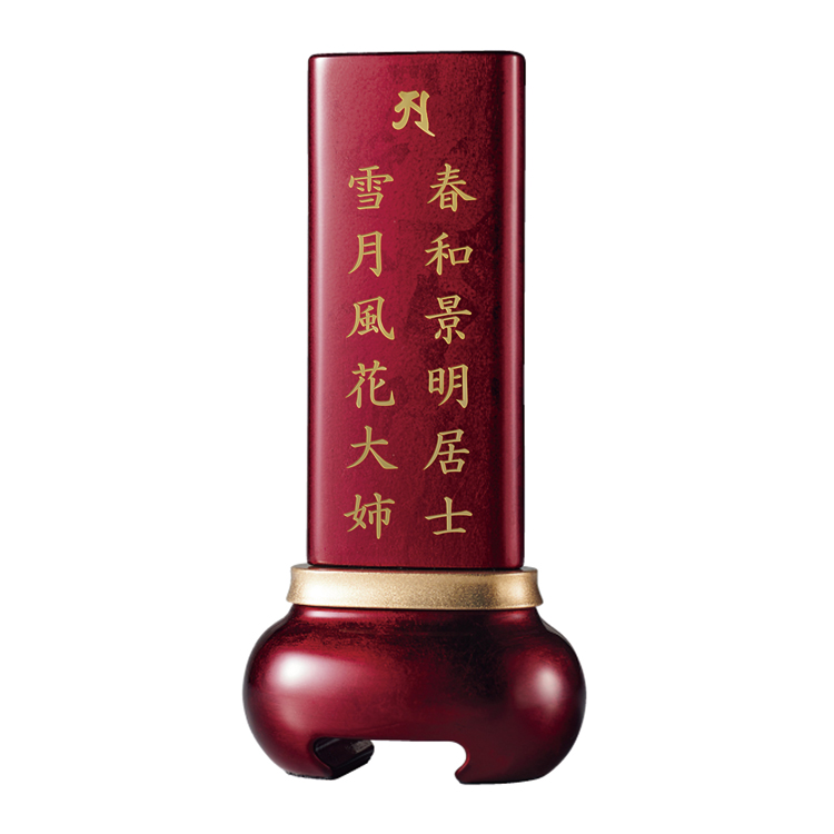 宝珠 レッド 4.0寸 ▼ 価格・仕様を見る 画像をクリックすると切り替わります 価格・仕様 商品名宝珠 レッド 4.0寸 価格(税込)¥95,700 サイズ (mm) W(幅) :80 D(奥行き) :55 H(高さ) :166 材質ホオ 金属箔 仕上ウレタン塗装鏡面仕上 製造国日本製 宝珠がモチーフのモダン位牌。塗装の奥に浮かび上がる金属箔の模様がおしゃれです。夫婦位牌にできるのでミニ仏壇や小さい手元供養にも最適です。名入れを別途承ります。 ▲制作を担当する塗装のエキスパート、栗原木工所を取材しました。 文字入れもセットでご注文ください 文字入れの詳細はこちら ページの先頭へ 関連商品 こもれび・オレンジ 3.5寸 過去帳・過去帳台 ¥14,300 ちりめんキャンドル Sakura LED お盆・盆提灯・お供物・仏花 ¥2,640 ラフィカブラック 4.0寸 位牌 ¥29,700