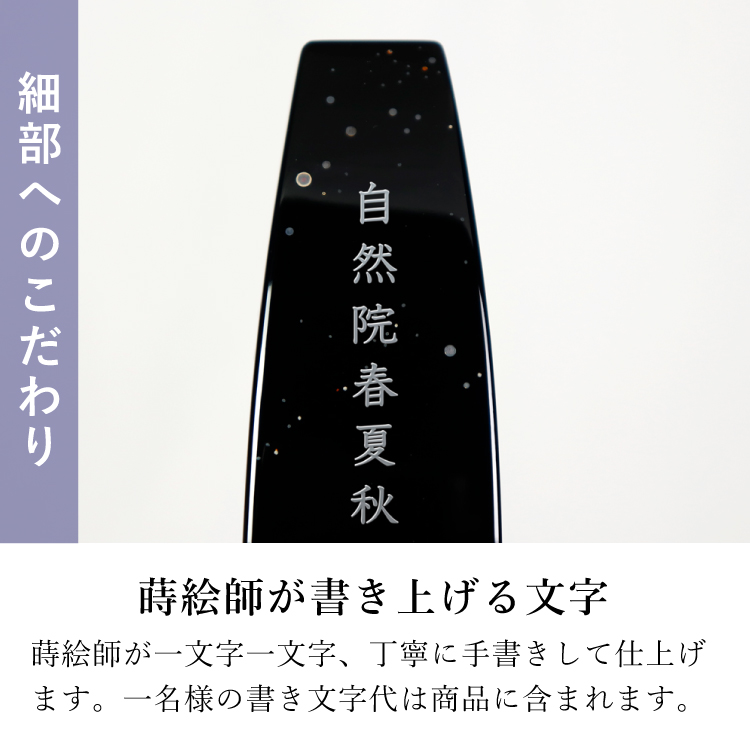 星 ほし ▼ 価格・仕様を見る 画像をクリックすると切り替わります 価格・仕様 商品名星 ほし 価格(税込)¥374,000 サイズ (mm) W(幅) :47 D(奥行き) :48 H(高さ) :197 材質漆 ホオ 仕上輪島塗布着せ本堅地呂色仕上 平文 製造国日本製 モダンな輪島塗位牌。蒔絵で静かな夜も見守ってくれる満点の星をおしゃれに描きました。お一人様の名入れ書き文字代込み。 ページの先頭へ 関連商品 ラムダII ブラック 3.5寸 位牌 ¥35,750 フィオーリ フリンジ FFS-010 念珠・その他仏具 ¥5,500 翠 みどり 位牌 ¥429,000