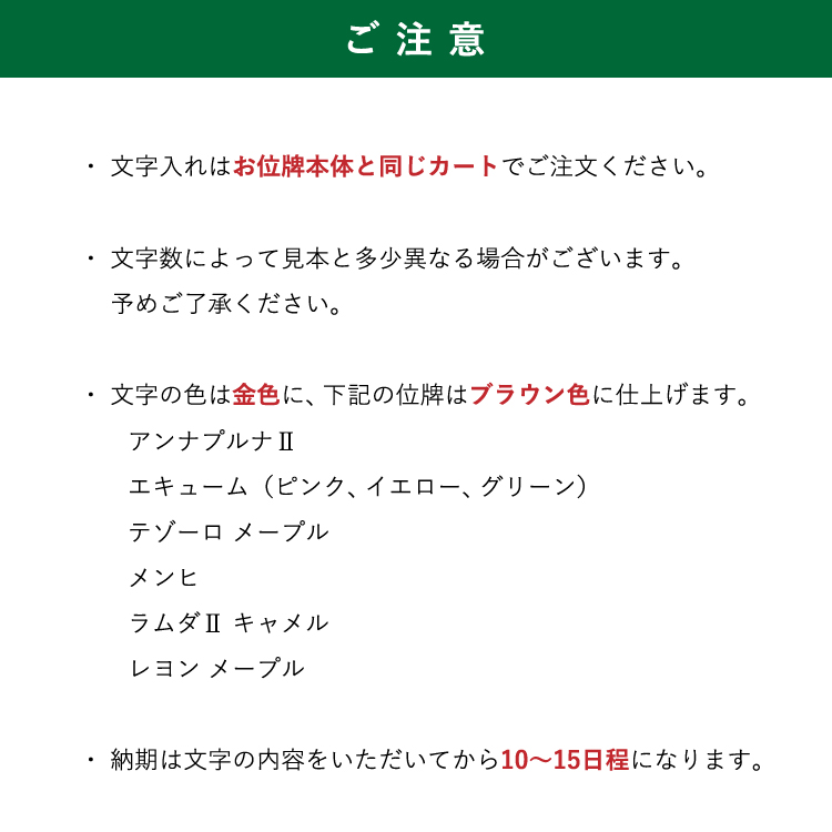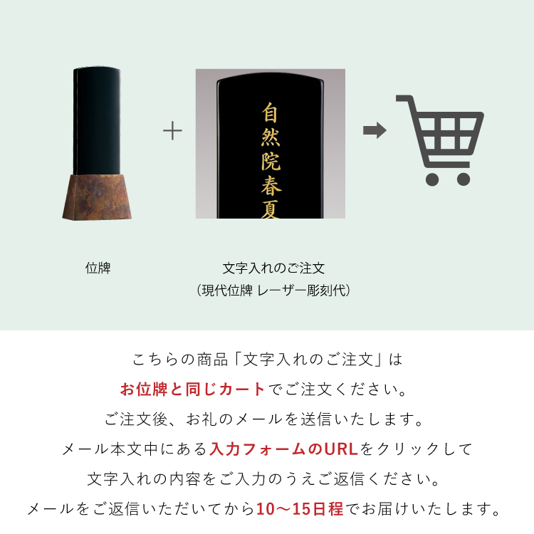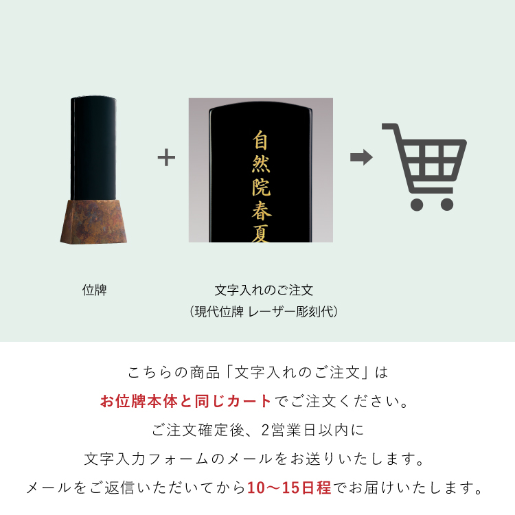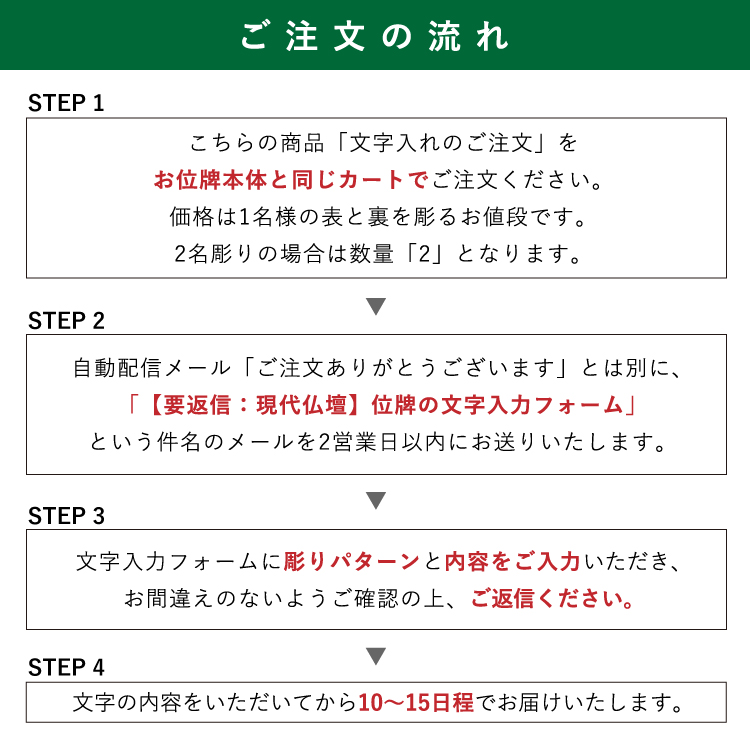 現代位牌 レーザー彫刻代 ▼ 価格・仕様を見る 画像をクリックすると切り替わります 価格・仕様 商品名現代位牌 レーザー彫刻代 価格(税込)¥7,150 お位牌の文字彫りの商品ページとなります。お位牌とセットでご注文下さい ページの先頭へ