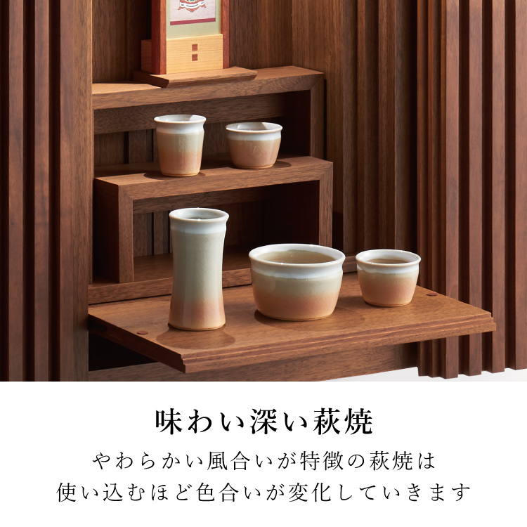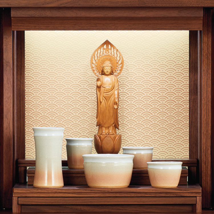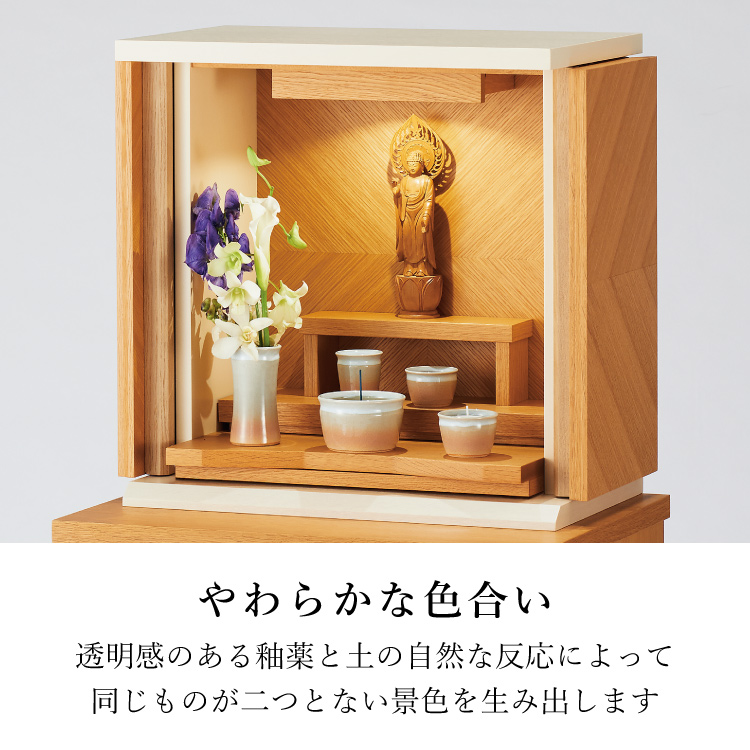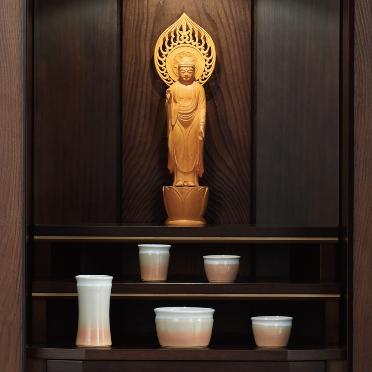 萩 ▼ 価格・仕様を見る 画像をクリックすると切り替わります 価格・仕様 商品名萩 価格(税込)¥25,300 材質陶器(萩焼 ) 備考クリスタルビーズ ローソク立て芯 フェルト付 製造国日本製 特徴的なピンク色は土の鉄分と酸素が結合して現れたもの。桜をイメージさせる人気の一品です。 ページの先頭へ 関連商品 月夜 リン台 L 念珠・その他仏具 ¥35,200 スピリッツ 4.0寸 位牌 ¥26,400 森林香 トール 仏具・神具 ¥19,800