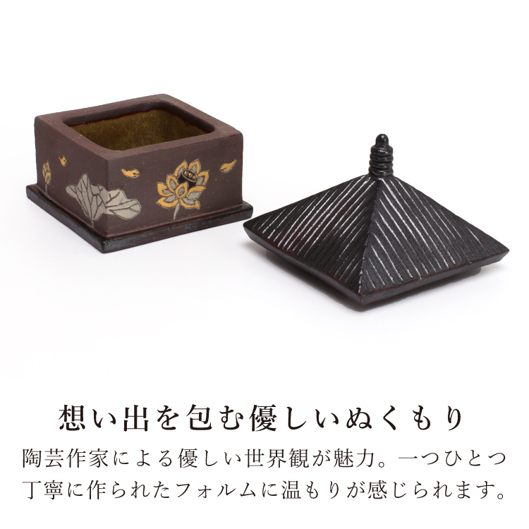 蓮想う ▼ 価格・仕様を見る 画像をクリックすると切り替わります 価格・仕様 商品名蓮想う 価格(税込)¥56,100 サイズ (mm) W(幅) :70 D(奥行き) :70 H(高さ) :80 材質陶器 備考内袋S フェルト 製造国日本製 温かみのある陶器製のミニ骨壺です。故人への想いを込めやすい形を揃えました。 ▲仏具の生みの親である市川和美氏が営む『一風工房』を取材しました。 ページの先頭へ 関連商品 メモリアルフラワー正月花 絹 お盆・盆提灯・お供物・仏花 ¥3,740 スピカ 4.5寸 位牌 ¥25,300 朧 おぼろ 銀 3.0寸 過去帳・過去帳台 ¥28,050