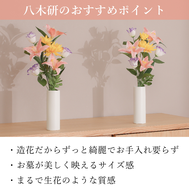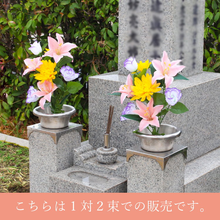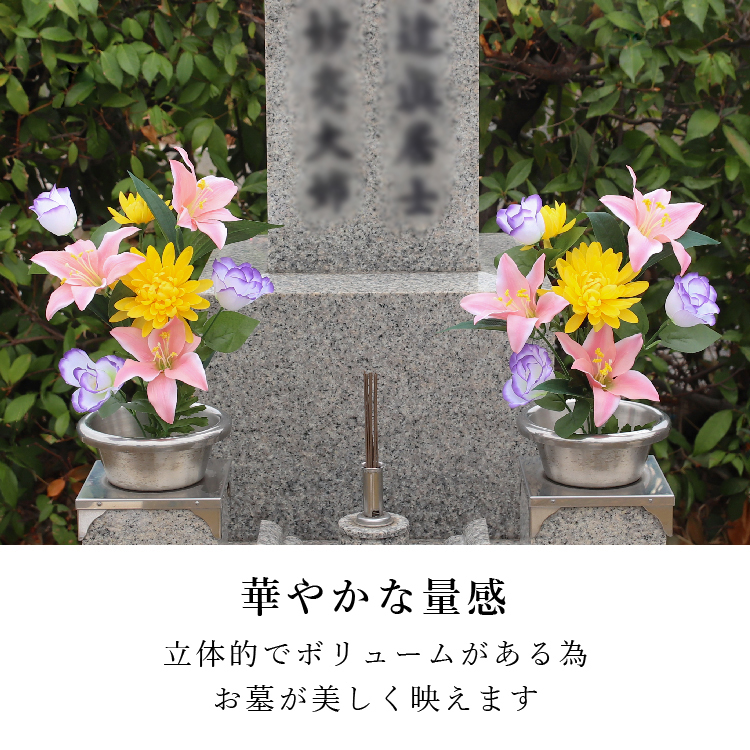 MF墓花 ピュアリリーII ▼ 価格・仕様を見る 画像をクリックすると切り替わります 価格・仕様 商品名MF墓花 ピュアリリーII 価格(税込)¥3,300 サイズ (mm) W(幅) :170 D(奥行き) :90 H(高さ) :430 材質ポリエステル ポリエチレン 製造国日本製 仏壇やお墓にお供えする造花です。一対(2本組み)のお供え花なので華やかに供養できて、お盆やお彼岸、法事などのお墓参りでは、枯れない墓花として生花のような美しさを長く保ちます。 ★こちらの商品もおすすめです★ ★おすすめコラム★ ページの先頭へ 関連商品 ラムダII ネイビー 4.0寸 位牌 ¥39,050 テゾーロ メープル 4.0寸 位牌 ¥48,400 星かご ミニ骨壺・コアボトル ¥25,300