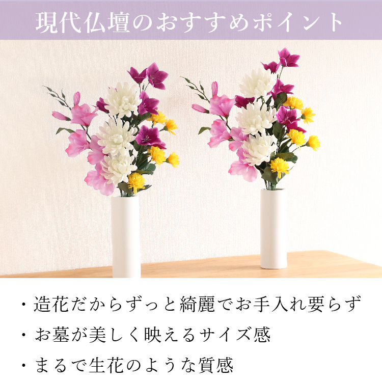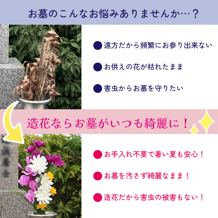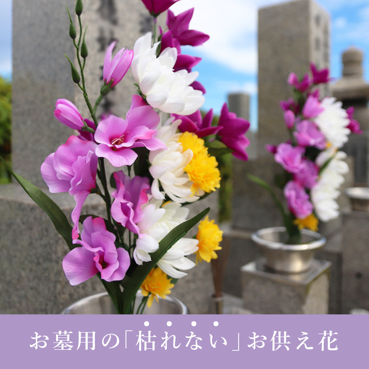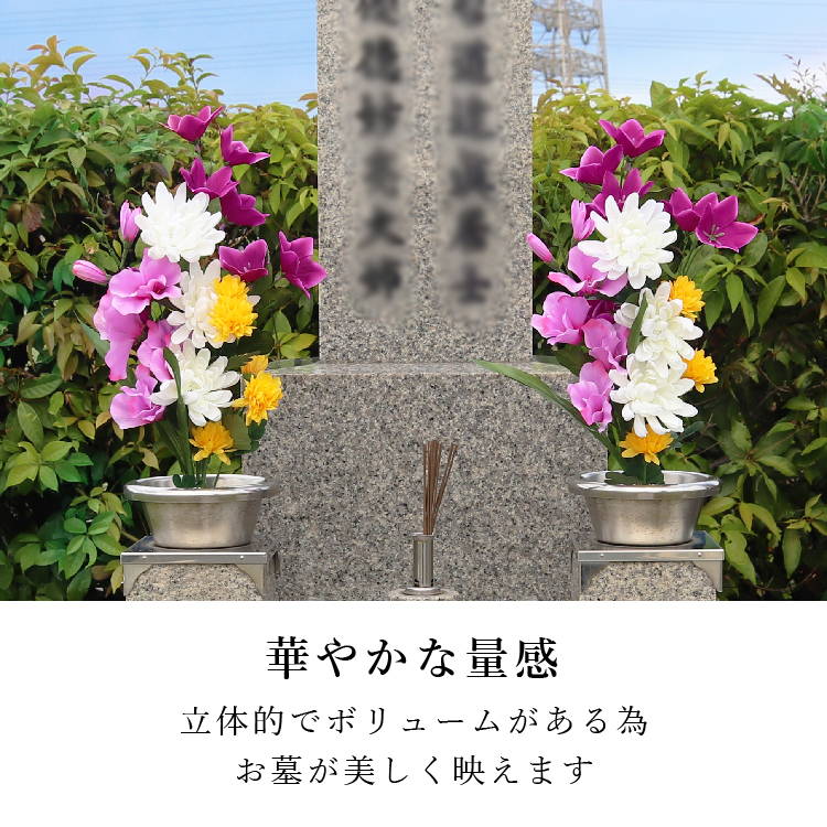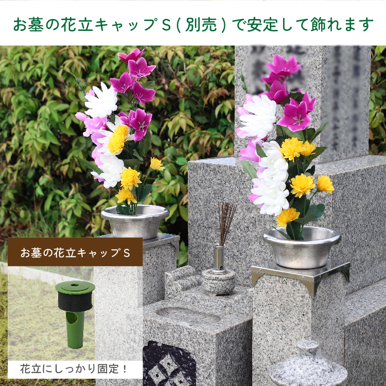 MF墓花 ノーブルマム ▼ 価格・仕様を見る 画像をクリックすると切り替わります 価格・仕様 商品名MF墓花 ノーブルマム 価格(税込)¥4,400 サイズ (mm) W(幅) :170 D(奥行き) :90 H(高さ) :460 材質ポリエステル ポリエチレン 仏壇やお墓にお供えする造花です。一対(2本組み)のお供え花なので華やかに供養できて、お盆やお彼岸、法事などのお墓参りでは、枯れない墓花として生花のような美しさを長く保ちます。 ページの先頭へ 関連商品 お墓の花立キャップS お盆・盆提灯・お供物・仏花 ¥495
