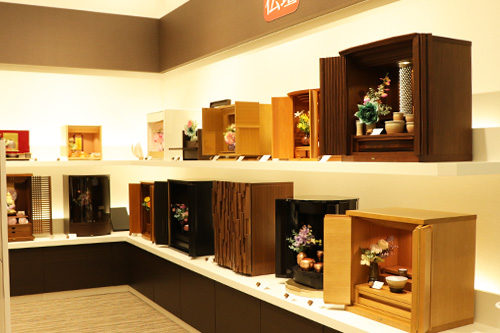 スリムで場所を取らない台付きタイプ、部屋全体を見守るような壁かけタイプなど、様々なバリエーションの仏壇を展示し、取り扱う仏壇は200種類以上。