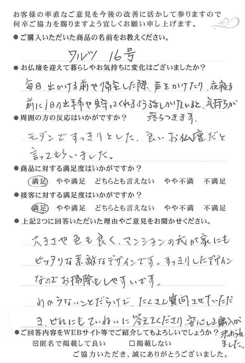 長時間に渡りいろいろな商品を丁寧に説明して頂いたおかげで満足のいく仏壇を選ぶことができた。コンパクトでありながら高級感があり使い勝手も良いです。(N様)