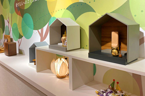 店内に入ると大きなガラス窓から光が差し込み、解放的な空間が広がります。正面の壁面にはご先祖様の魂が宿る「里山」をイメージした緑の木々とともに、ご先祖様を大切にする想いを表現した「愛する人へのコミュニケーション」のメッセージが描かれています。