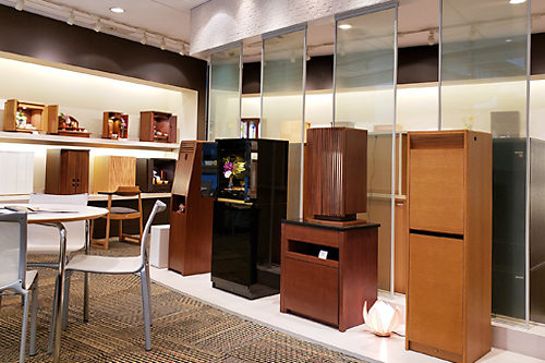 ▲ 日本製のベーシックなデザインから、イタリア製のエレガントなデザインまで、実にバラエティに富む台付きタイプのコーナー。ご家庭の雰囲気や、「床に座ってお参りしたい」「ゆったりと椅子に座って向き合いたい」など、ご要望に合わせてご提案いたします。