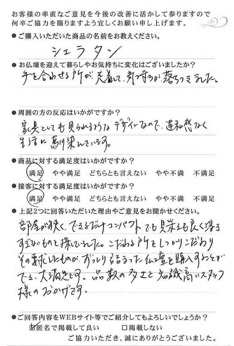 スタッフの人がこちらの気持ちに寄り添って下さいました。私の希望を詰め込んだ大満足のお仏壇で、小物も気に入っています。喪失感を完全に埋める事は出来ませんが、自分を癒しながらお仏壇を守っていきたいと思います。(H様)