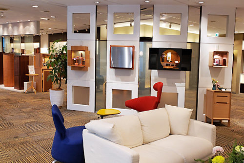 ▲ 家庭のリビングを再現したコーナーです。色々悩まれたなら、ぜひこちらでご休憩ください。また、システム収納家具に入る仏壇もこちらに展示しており、座った位置から見え方をチェックできます。
