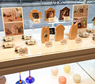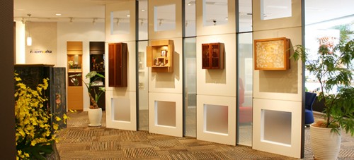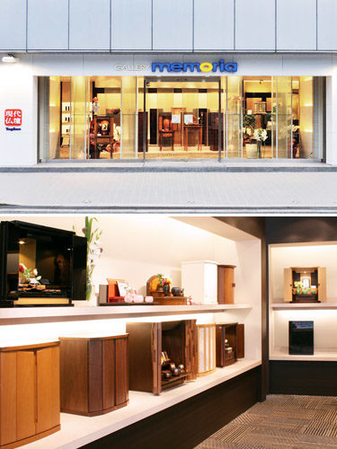 ▲ エントランス付近のガラス棚にはおしゃれな仏具や骨壷、手元供養品などを展示しています。仏壇とのコーディネートは自由自在。気になるものがありましたら、実際にセットさせていただきます。