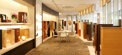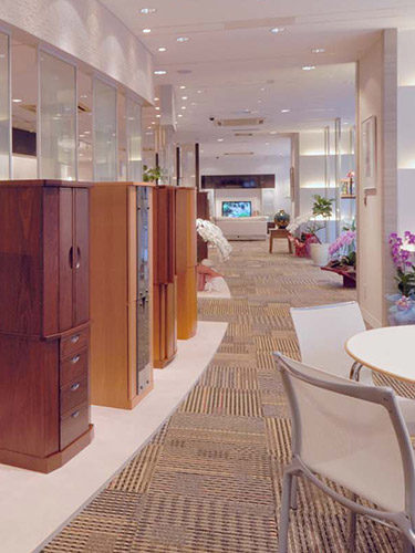 ▲ ワイドに広がるワンフロアの店内は、照度を押さえたライティングでとても落ち着いた雰囲気。仏壇は大切な人をお祀りする『特別な祈りのスペース』だからこそ、ゆったり落ち着いた気分でお選びいただきたい…そんな想いから、お客様にリラックスしていただけるように、観葉植物や美しい花を飾って癒しの空間を演出しています。