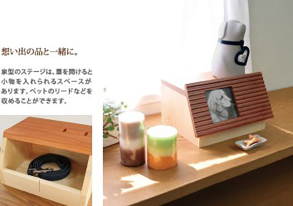 日常に溶け込むあたたかみのある木のステージです。フォトフレームと収納スペース付きで、中にリードやおもちゃなど思い出の品を入れられます。また付属のネジで本体天面とモニュメントの底面を連結させて固定出来るので、ズレ落ちたりせずに安心です。