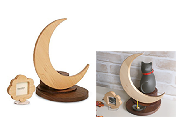 美しい月と雲の写真立てが印象的な無垢材のステージ。職人の手作りで木のぬくもりが感じられます。骨壺のモニュメントを包み込み、インテリアとしても想い出を演出します。