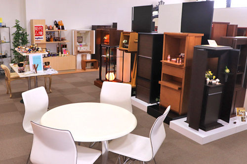 広い店内の1階に現代仏壇を多数取り揃えています。
