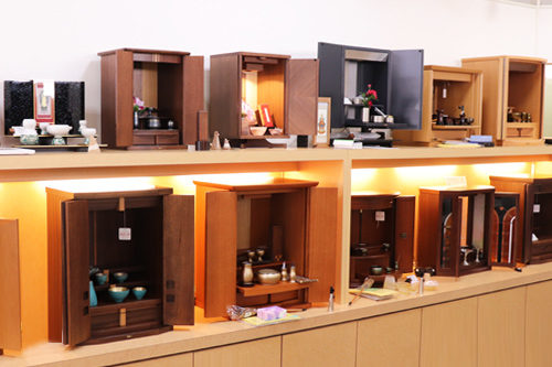 さまざまなサイズやデザインのモダンな現代仏壇を展示。
