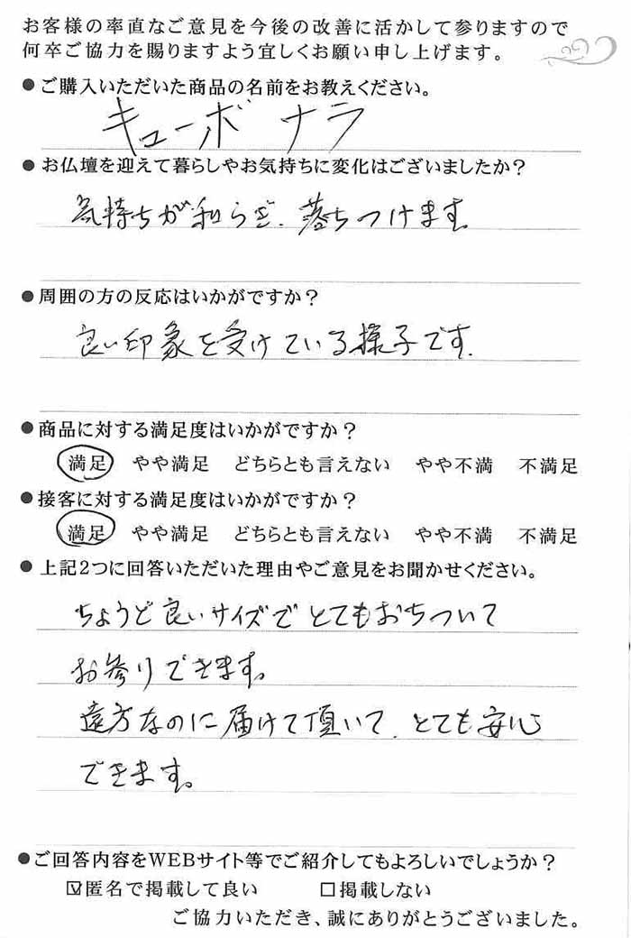 マンションに置ける大きさ、デザイン、価格に満足しています。仏壇を置くことで両親のことをよく思い出すようになりました。(I様)