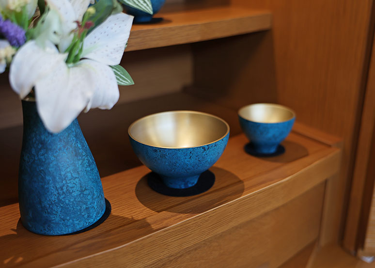 お仏具も現代仏壇にぴったりのモダンデザインを展示しています