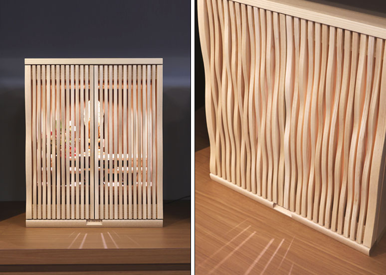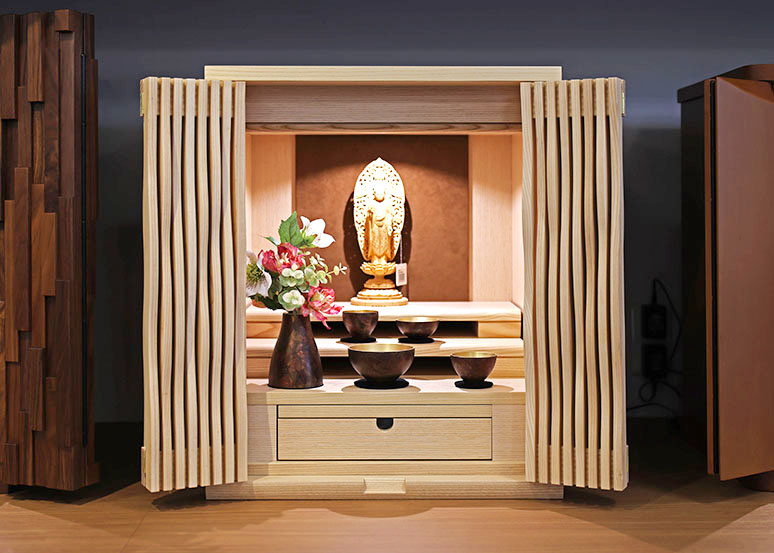 波状の格子は旭川クラフトによるこだわりの技術で制作されています。扉を閉じていても内部の様子がうかがえて、いつでも大切な方をそばに感じられます。