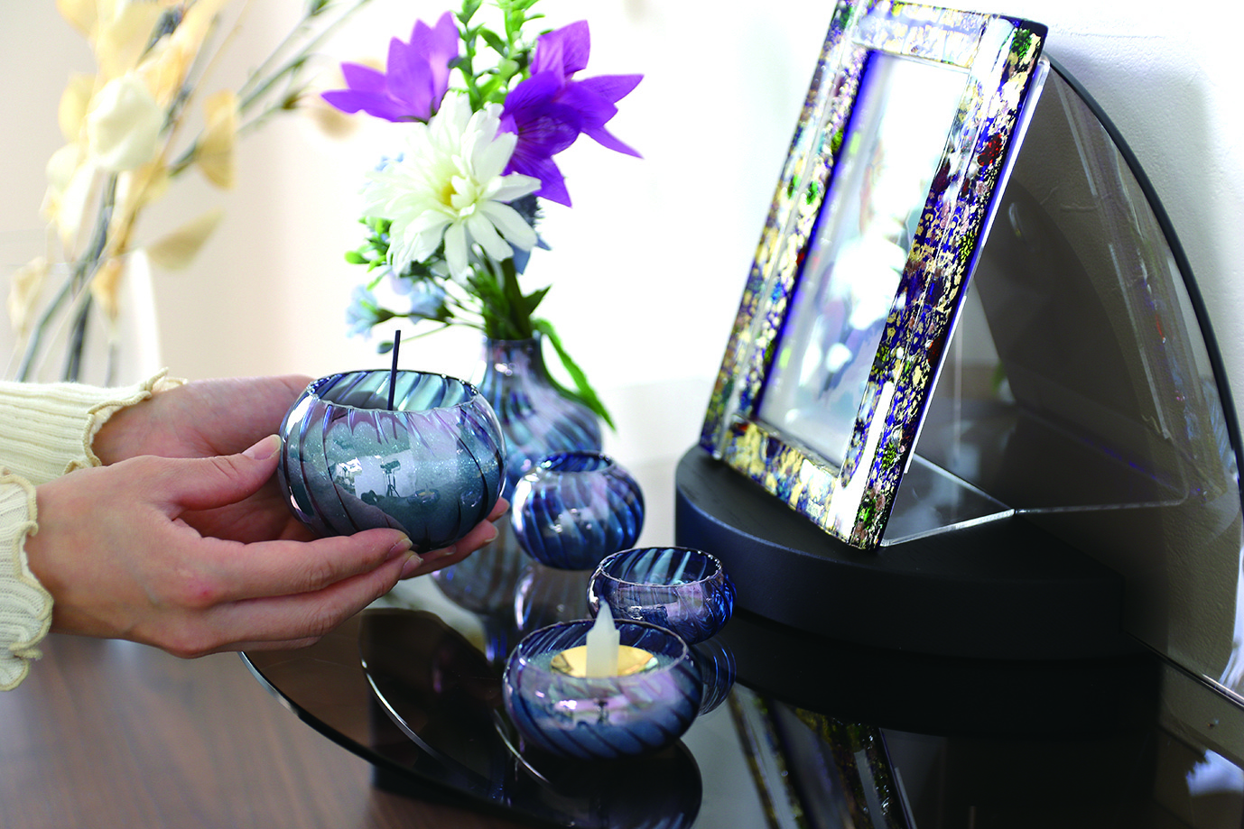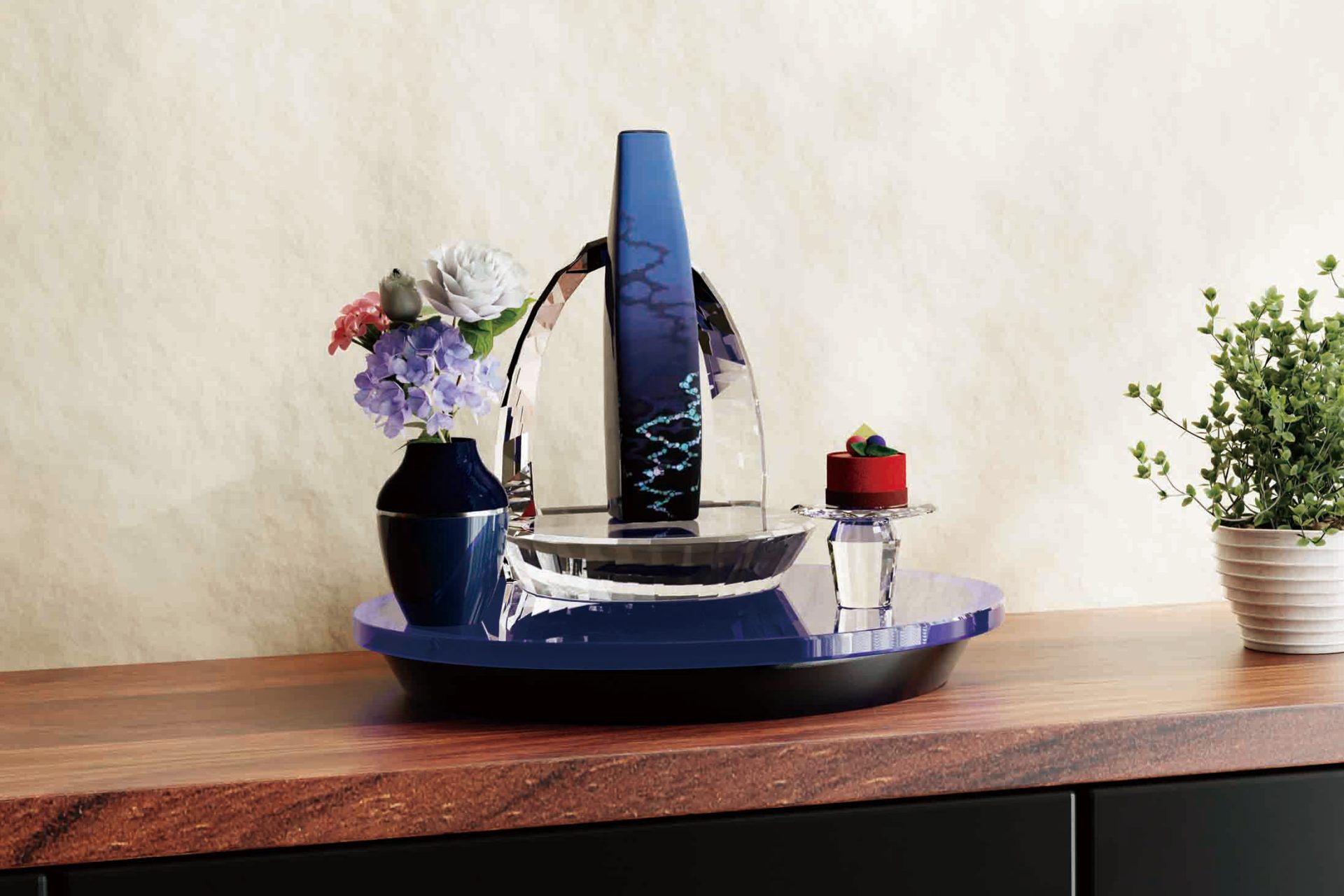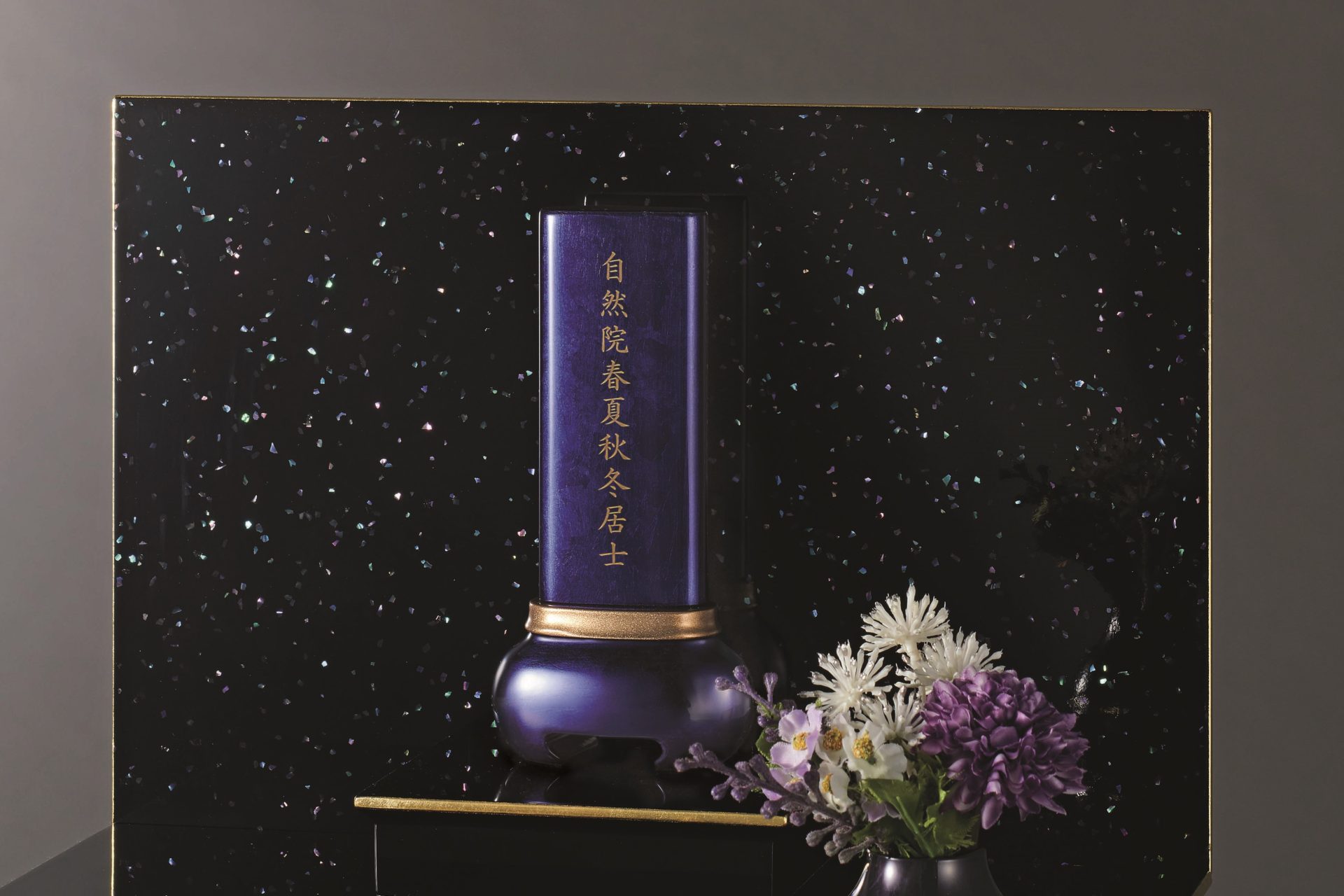 上品に浮かび上がる箔の模様が唯一無二の表情を見せる「位牌 宝珠ブルー」