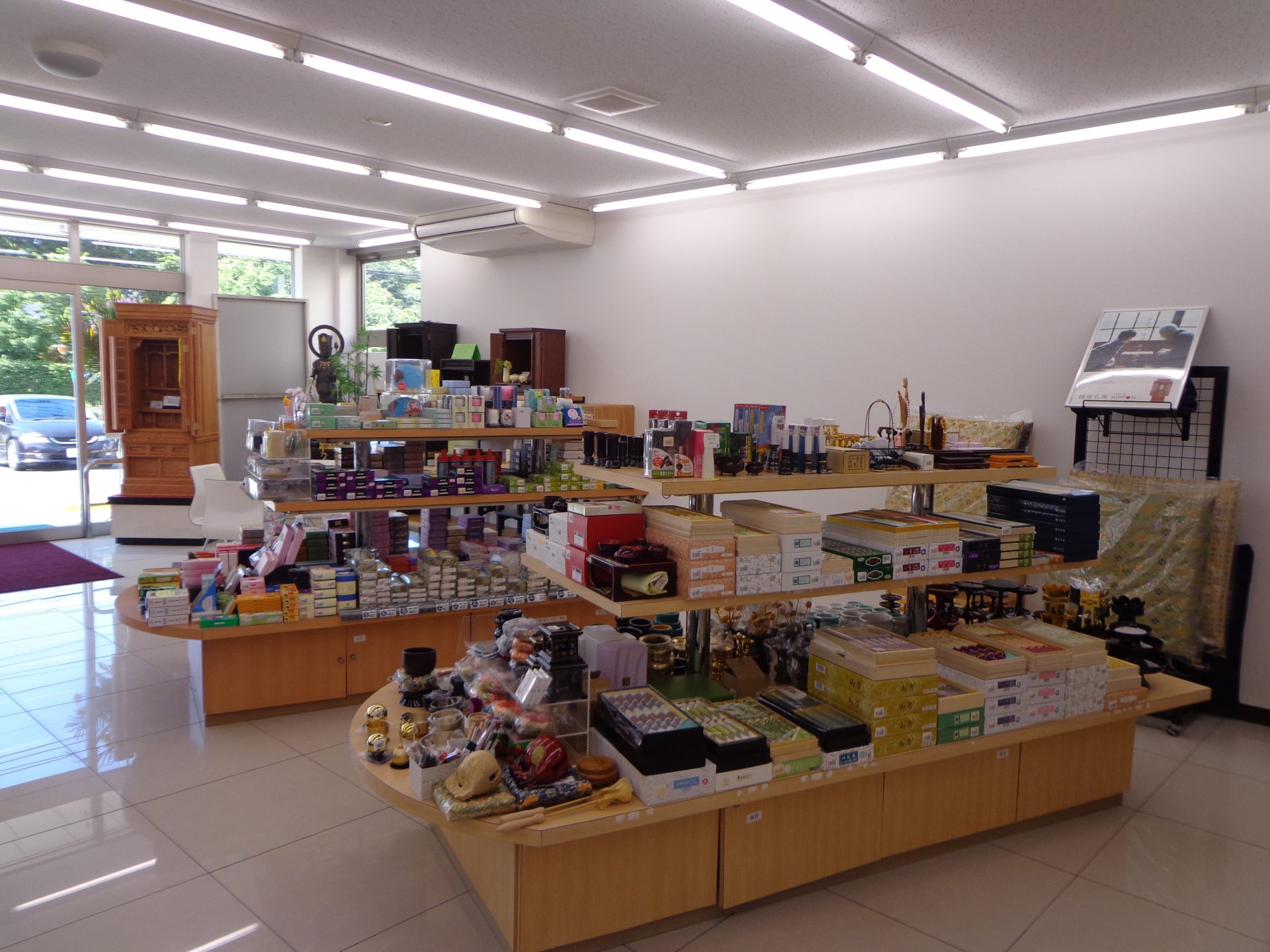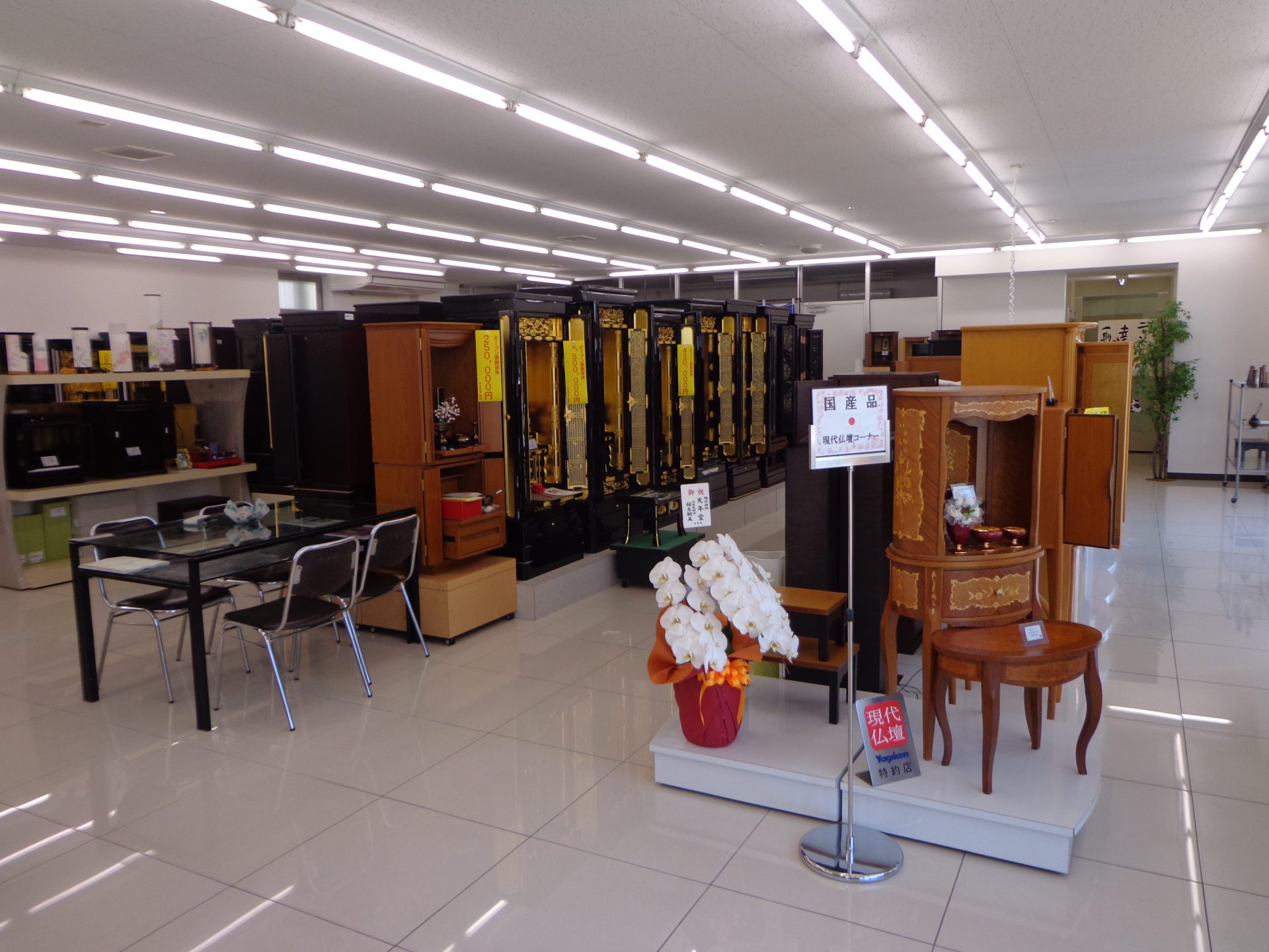 地域の皆様には長年お世話になっております。歴史が息づく史跡の街、太宰府の大通り沿いにある路面店です。明るく落ち着いた雰囲気の店内には、手前に線香・仏具、奥に行くに従って大きなサイズの仏壇が並びます。コンパクトなミニ仏壇から伝統型の大型高級仏壇、さらにモダンなリビングが似合う現代仏壇まで、幅広い品揃えで常時80基を展示しています。店舗マップ