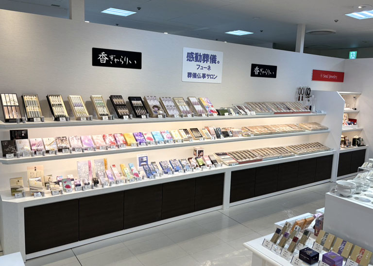 店頭には様々な種類のお線香や小物をラインナップ。お線香とは思えないような可愛いパッケージのものもあります。