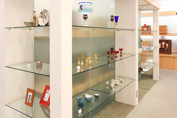 明るく開放感のあるガラス棚には五具足や手元供養品が並びます。